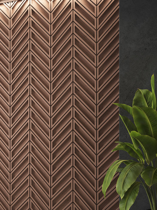 Miękko profilowane krawędzie jodełki – elegancki półcień. Relief pracuje światłem, zmieniając odbiór ściany w zależności od kierunku i natężenia oświetlenia. Zastosowania: ściany akcentowe, lobby/recepcje, korytarze, strefy wejścia, sypialnie; wybrane aplikacje zewnętrzne zgodnie z wytycznymi montażu. Atuty techniczne: beton architektoniczny barwiony w masie, wysoka trwałość, spójna kolorystyka, modułowość ułatwiająca projektowanie.
