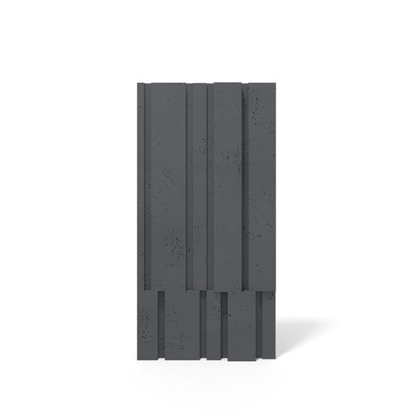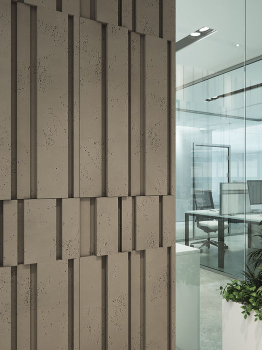 Rygor prostych pasów w kilku wysokościach – elegancki, uporządkowany rytm. Relief pracuje światłem, zmieniając odbiór ściany w zależności od kierunku i natężenia oświetlenia. Zastosowania: ściany akcentowe, lobby/recepcje, korytarze, strefy wejścia, sypialnie; wybrane aplikacje zewnętrzne zgodnie z wytycznymi montażu. Atuty techniczne: beton architektoniczny barwiony w masie, wysoka trwałość, spójna kolorystyka, modułowość ułatwiająca projektowanie.