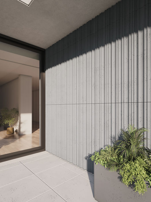 Powtarzalne „impulsy” – ściana pulsuje światłem. Relief pracuje światłem, zmieniając odbiór ściany w zależności od kierunku i natężenia oświetlenia. Zastosowania: ściany akcentowe, lobby/recepcje, korytarze, strefy wejścia, sypialnie; wybrane aplikacje zewnętrzne zgodnie z wytycznymi montażu. Atuty techniczne: beton architektoniczny barwiony w masie, wysoka trwałość, spójna kolorystyka, modułowość ułatwiająca projektowanie.