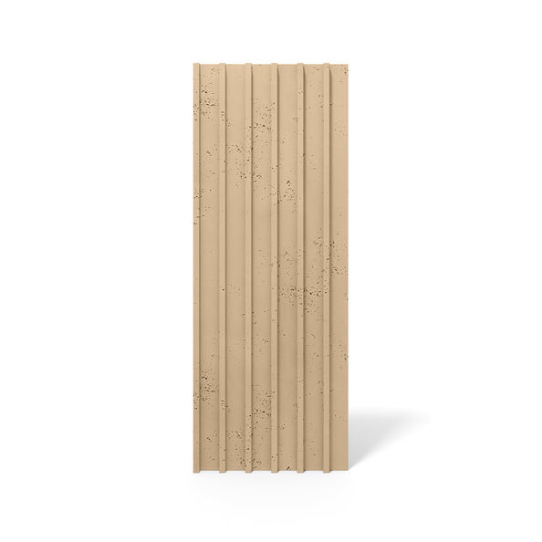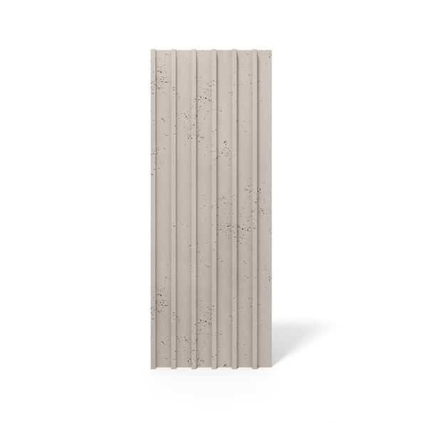 Regularne piony, które optycznie podnoszą proporcje pomieszczeń. Relief pracuje światłem, zmieniając odbiór ściany w zależności od kierunku i natężenia oświetlenia. Zastosowania: ściany akcentowe, lobby/recepcje, korytarze, strefy wejścia, sypialnie; wybrane aplikacje zewnętrzne zgodnie z wytycznymi montażu. Atuty techniczne: beton architektoniczny barwiony w masie, wysoka trwałość, spójna kolorystyka, modułowość ułatwiająca projektowanie.